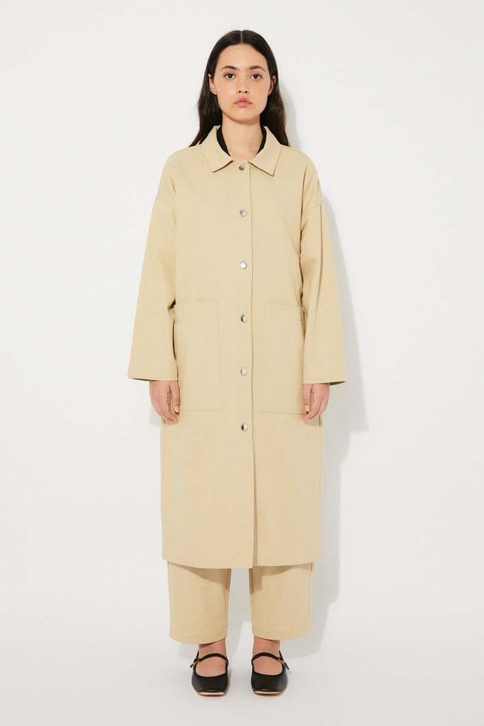Rigid cotton denim long jacket that softens with time and use. Button closure. Oversized style with dropped shoulders, discreet side pockets and front flap pockets. "Fallen fruit" motif printed on the back.